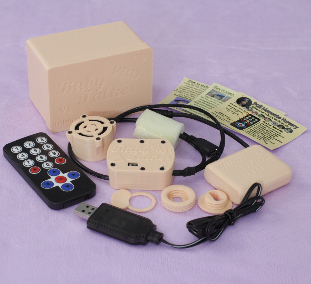 The Baby Talker Pro includes a small rechargeable USB battery pack & USB charger.