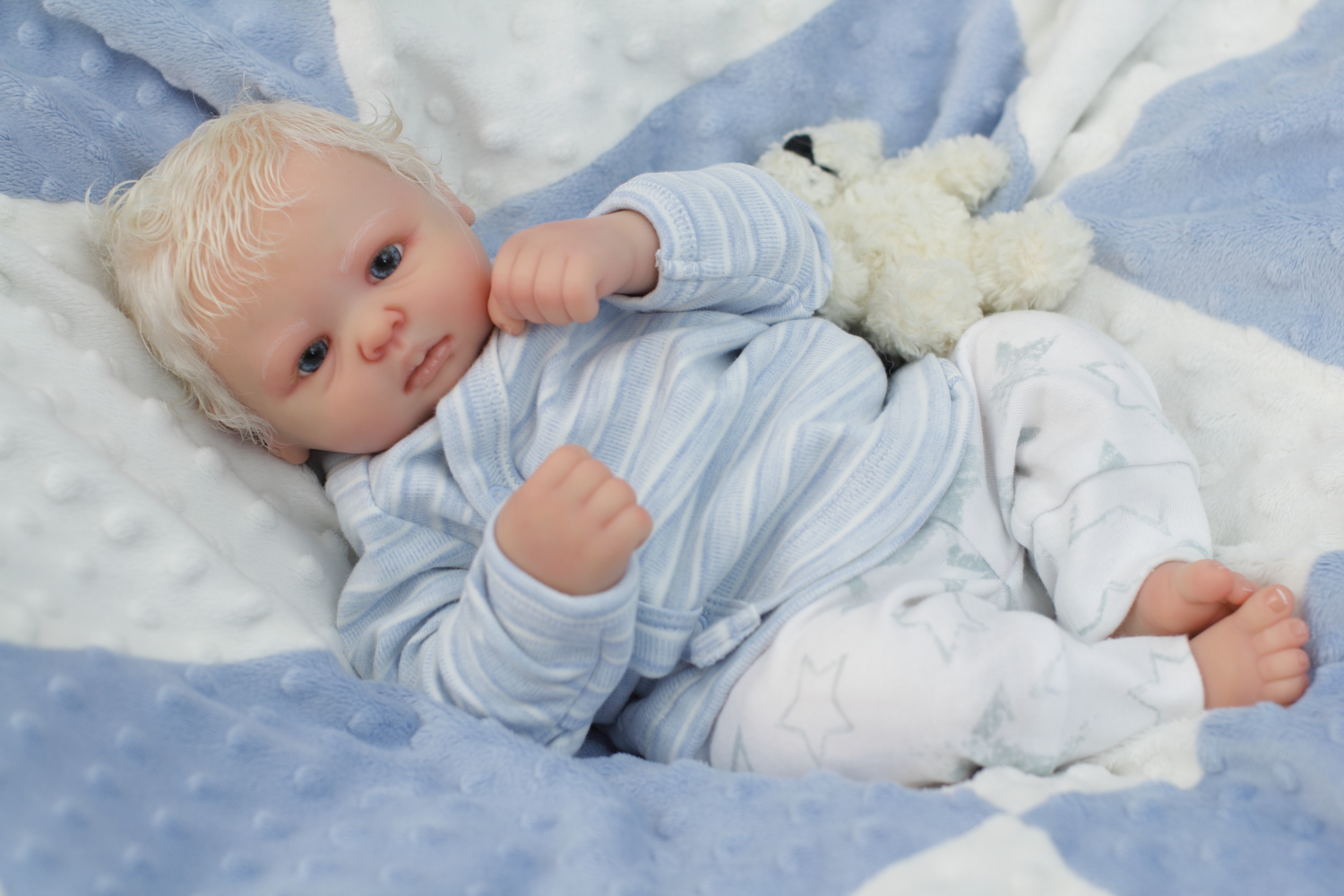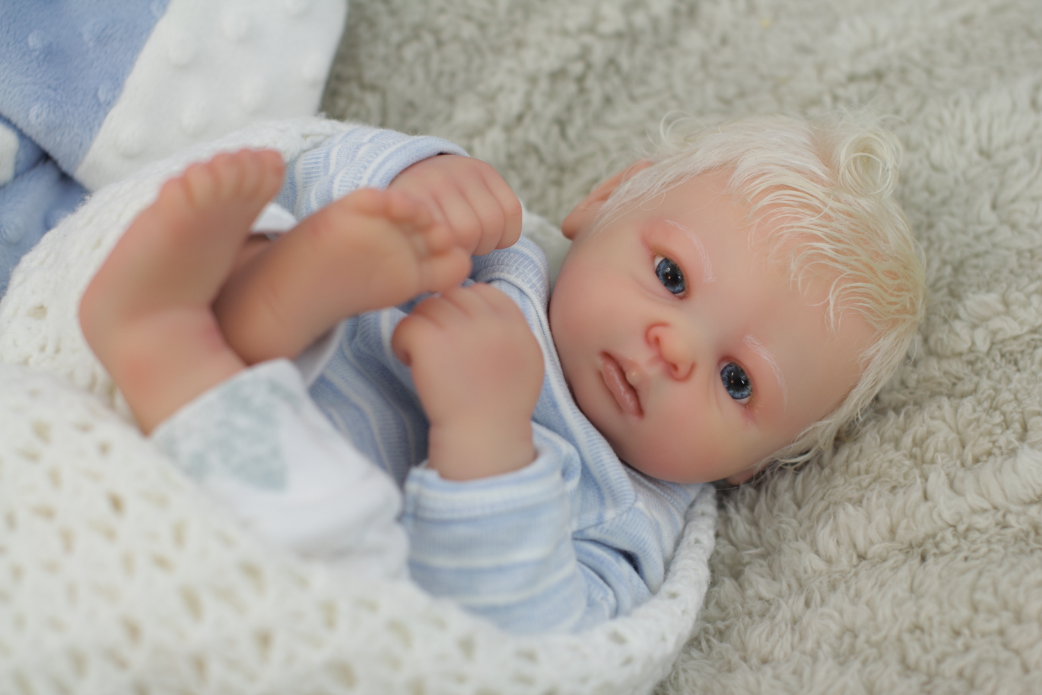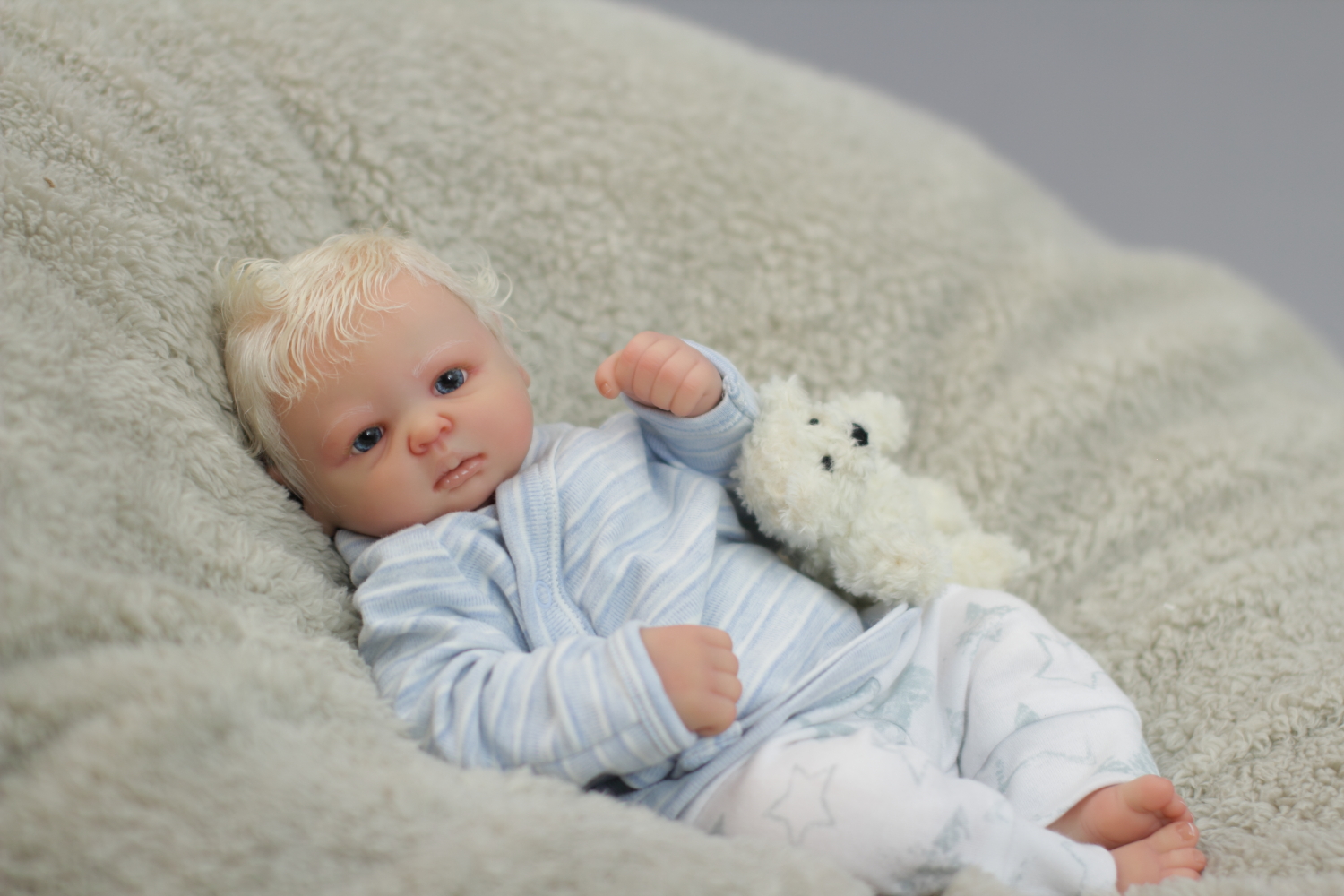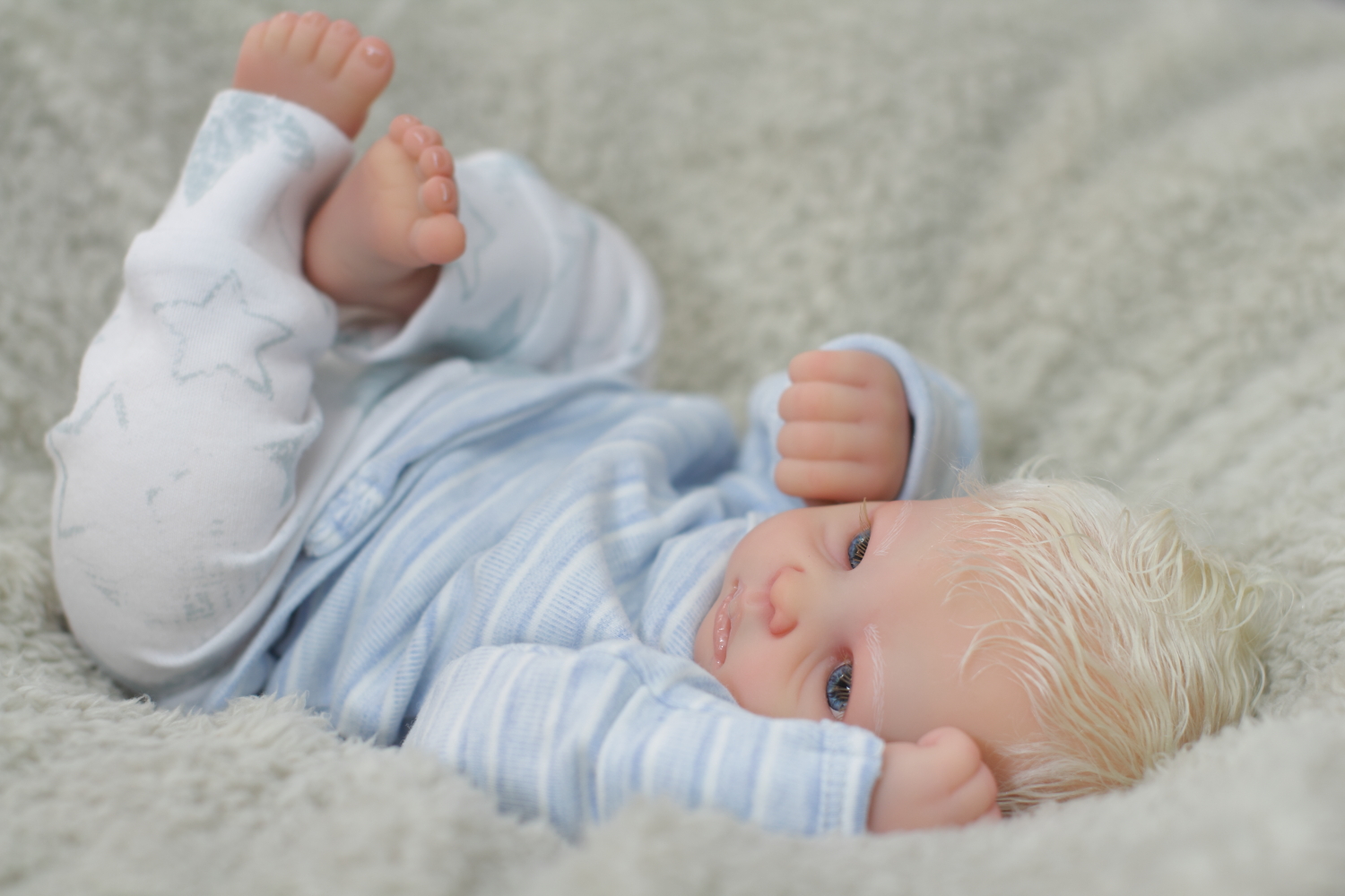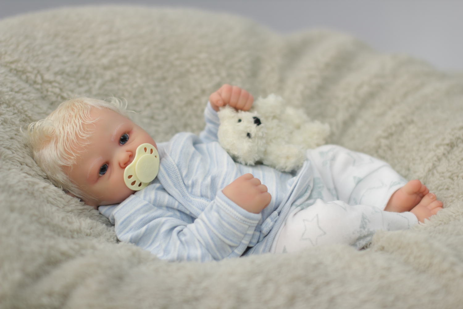 On open eyed babies only high quality polyglass or glass eyes are used, they are specially designed to resemble ultra realistic baby eyes in every detail.