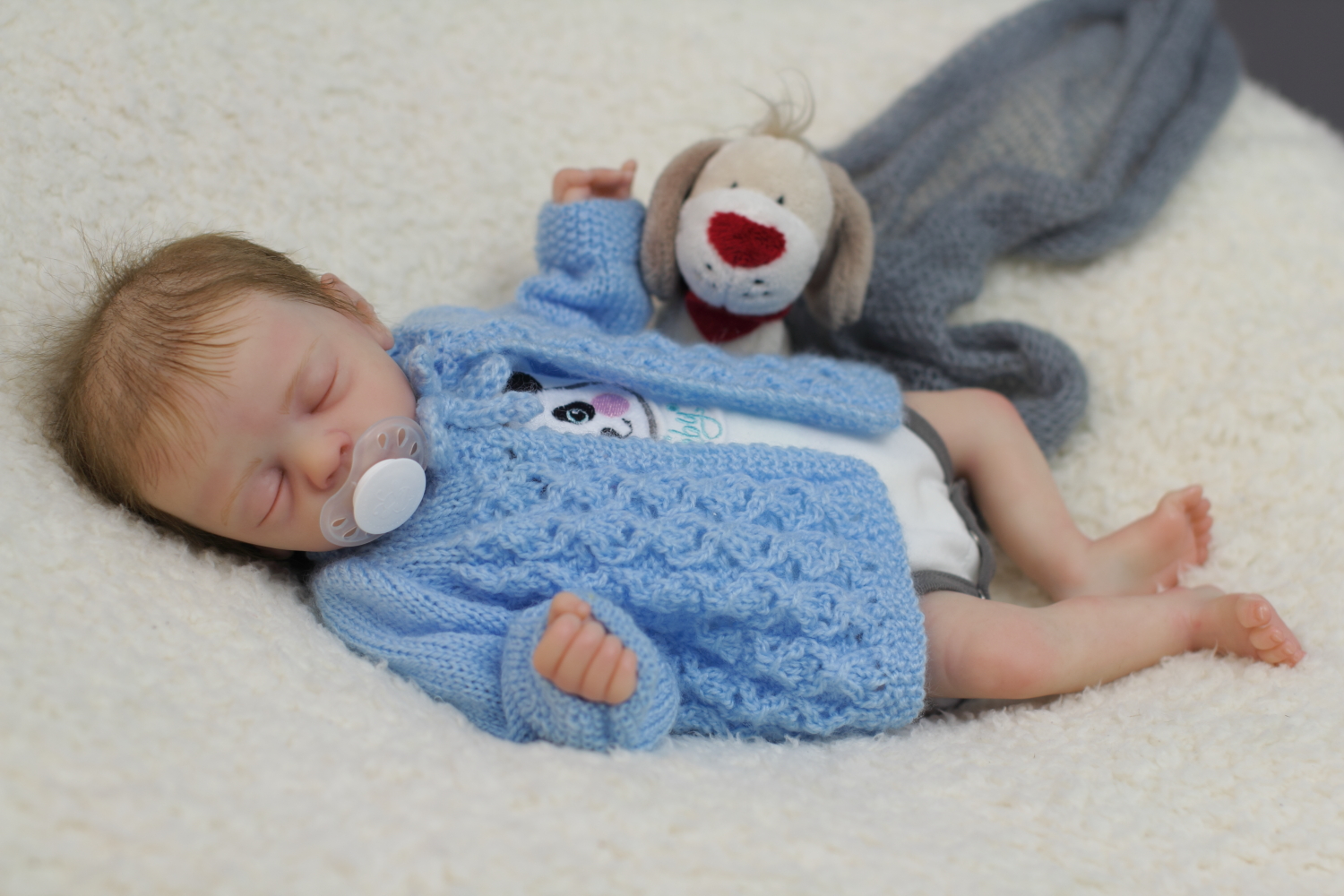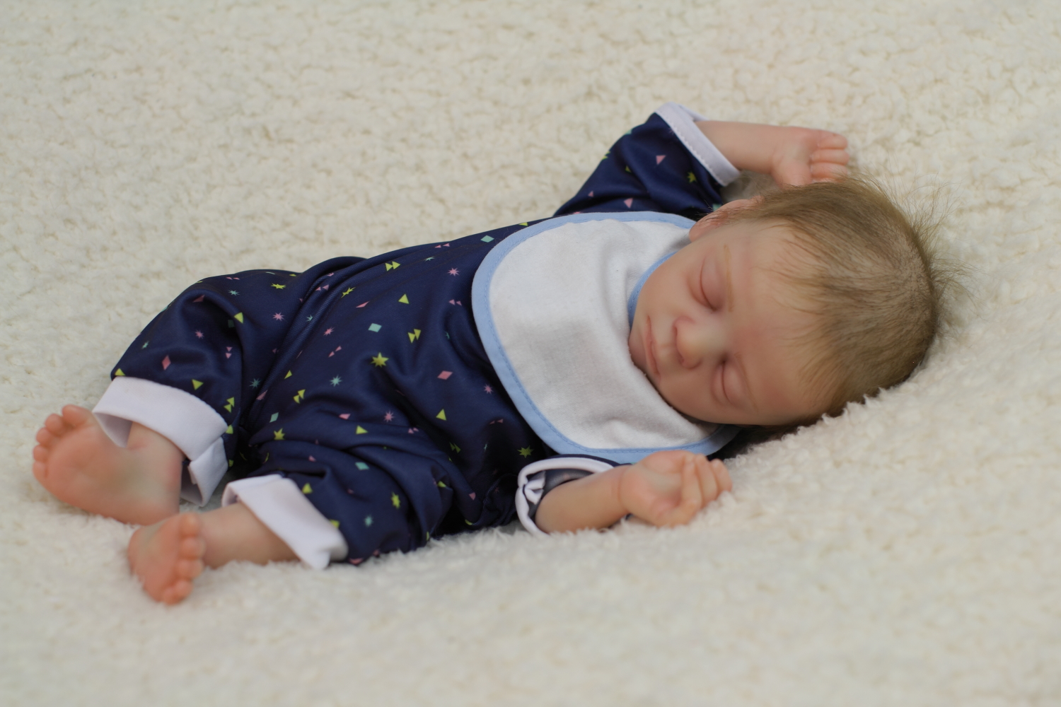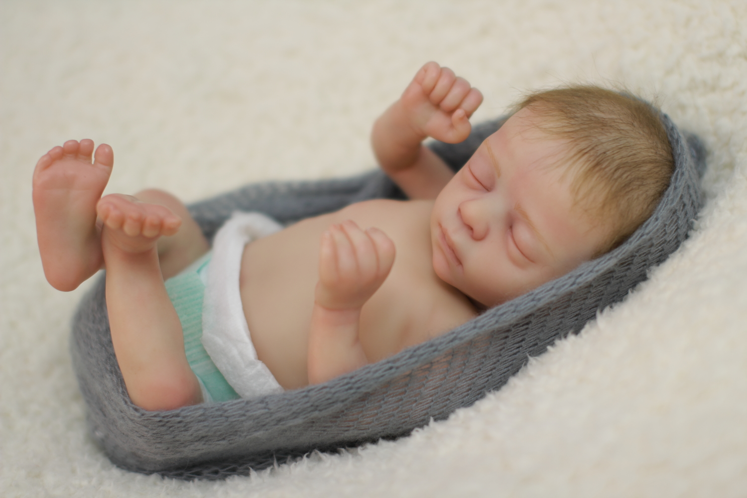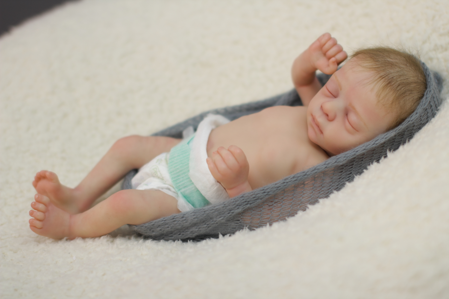 The body is weighted with large glass beads contained with a sack, then filled out with quality polyfill making the baby nice and cuddly and feeling like your holding a real baby.
