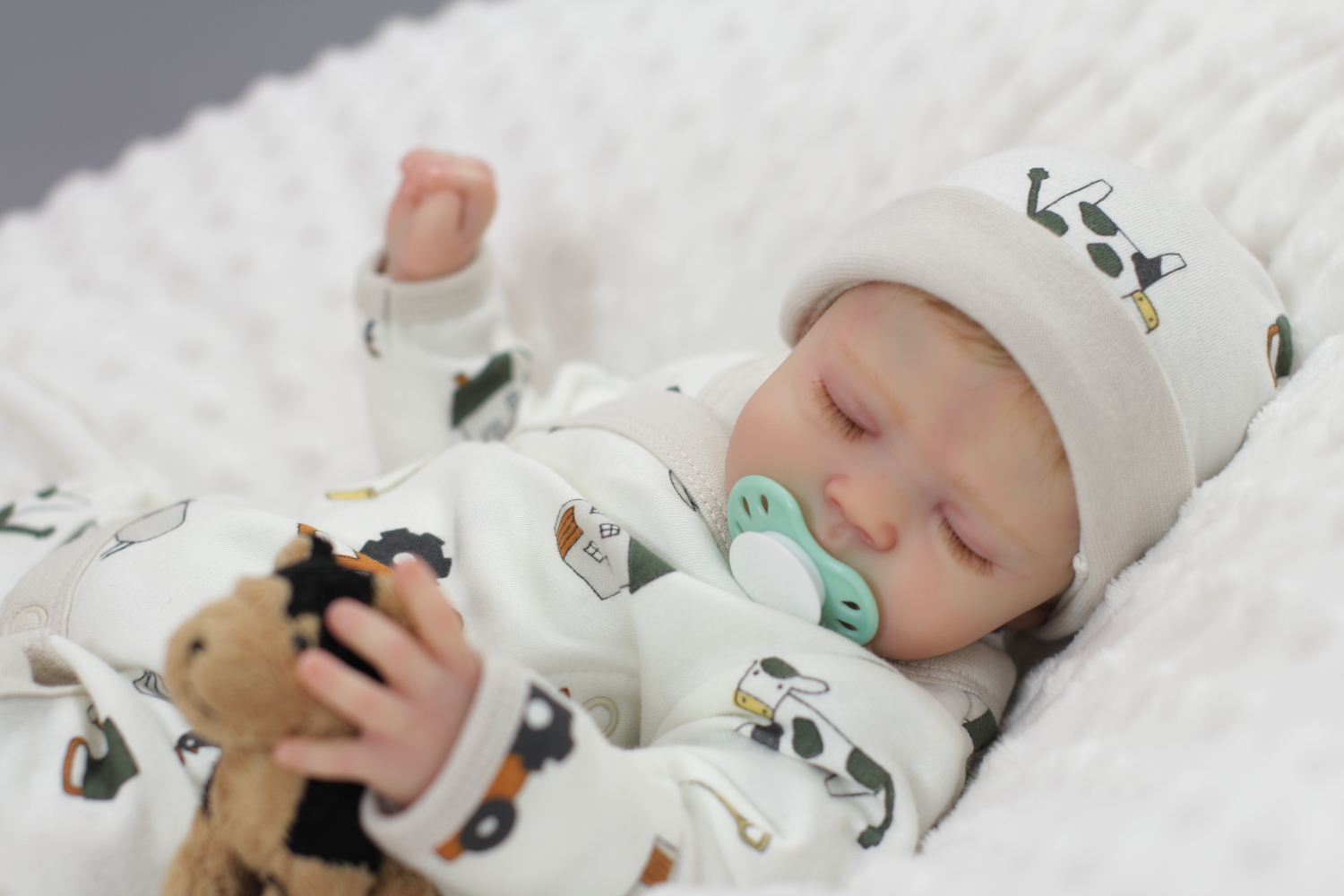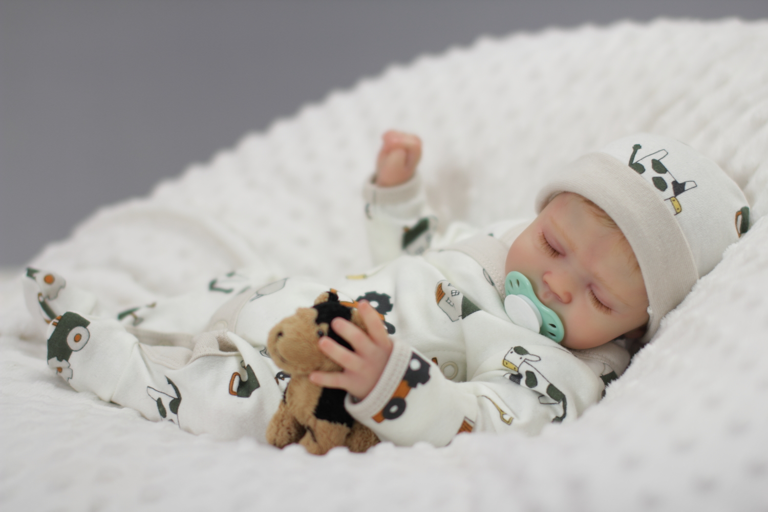 The body is weighted with large glass beads contained with a sack, then filled out with quality polyfill making the baby nice and cuddly and feeling like your holding a real baby.