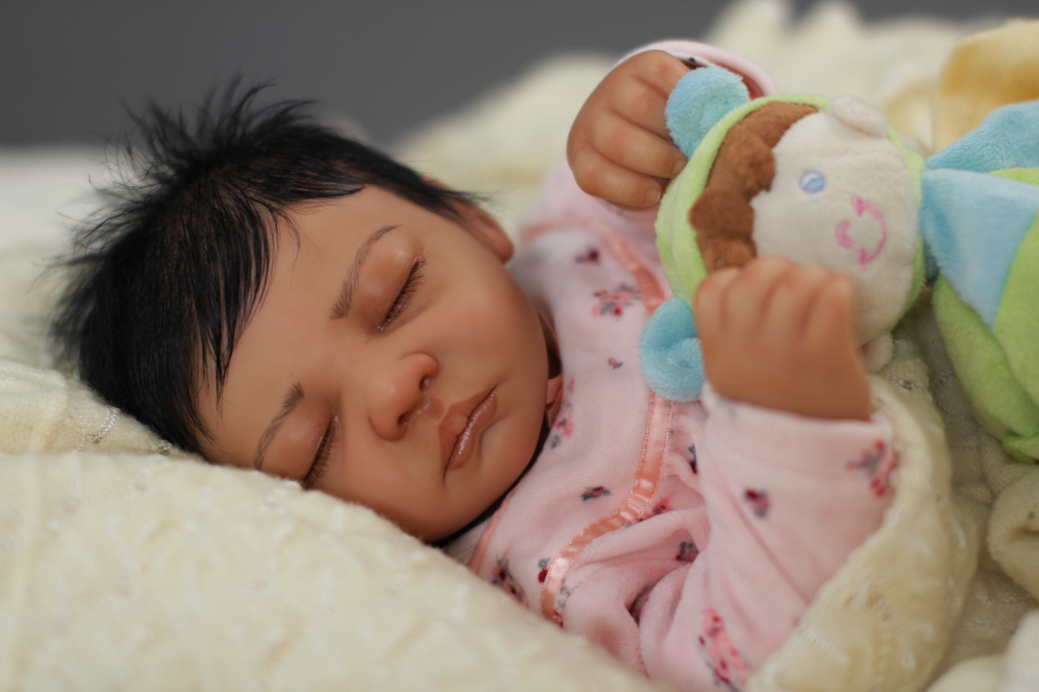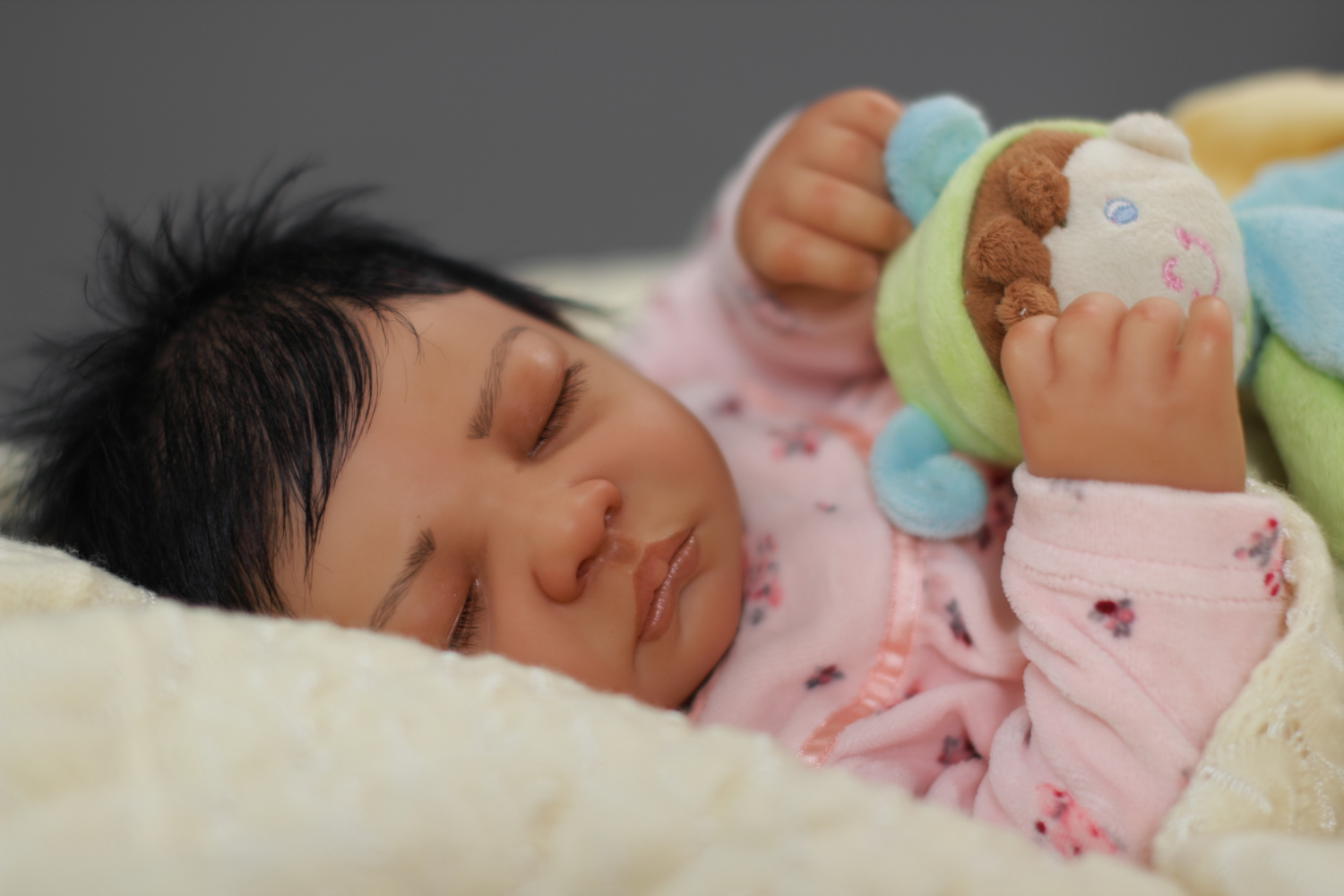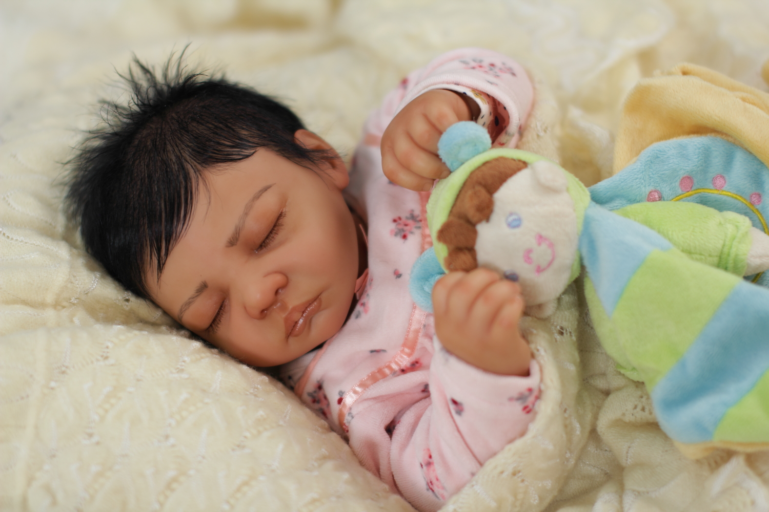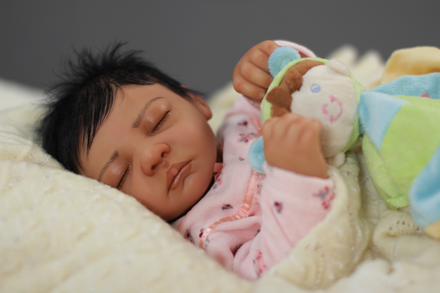 The body is weighted with large glass beads contained with a sack, then filled out with quality polyfill making the baby nice and cuddly and feeling like your holding a real baby.