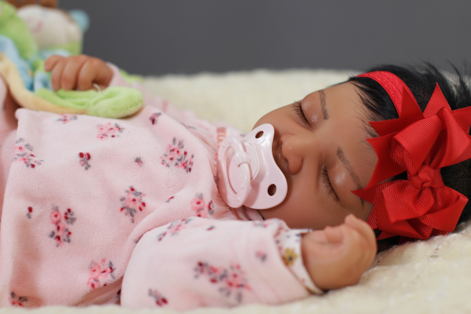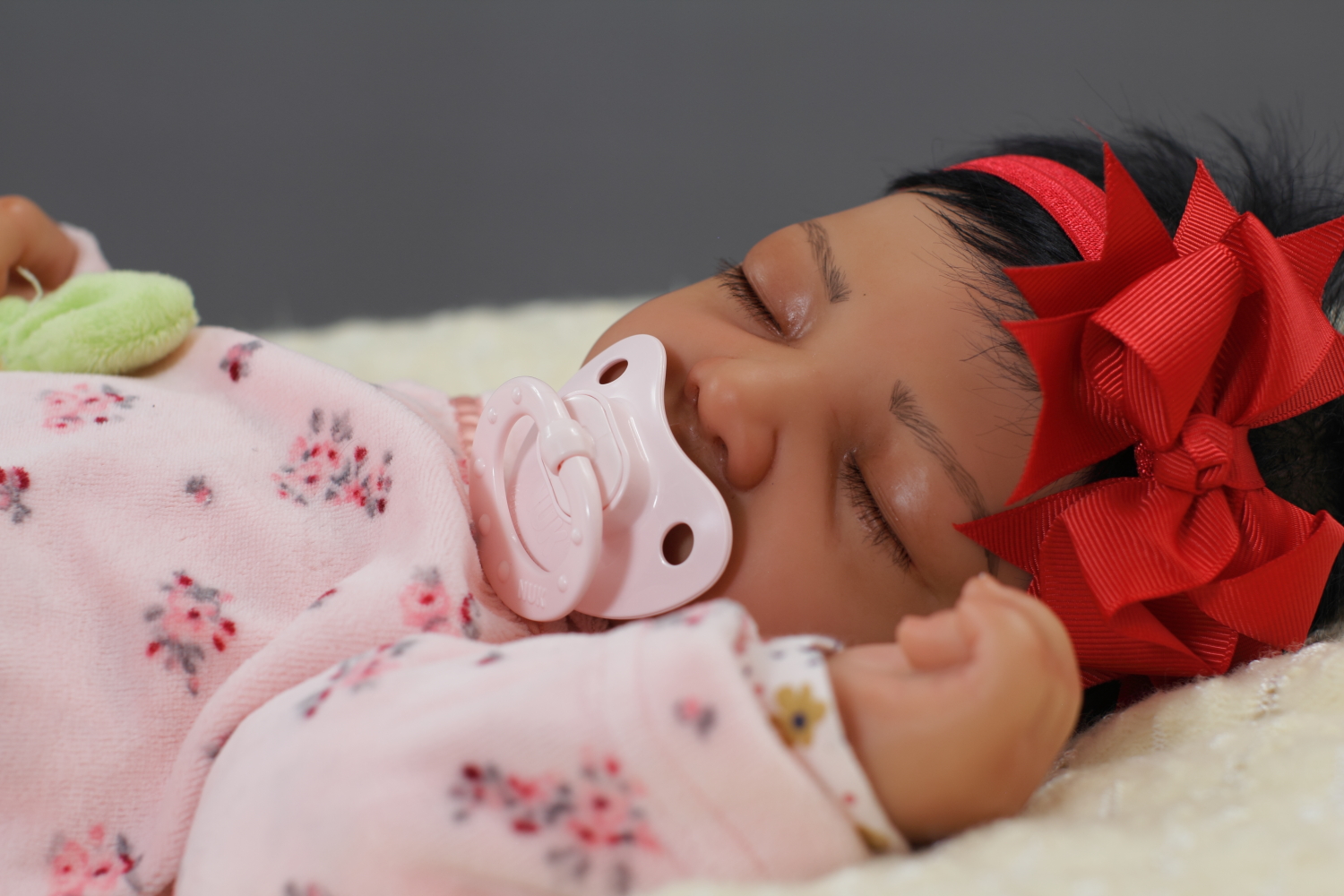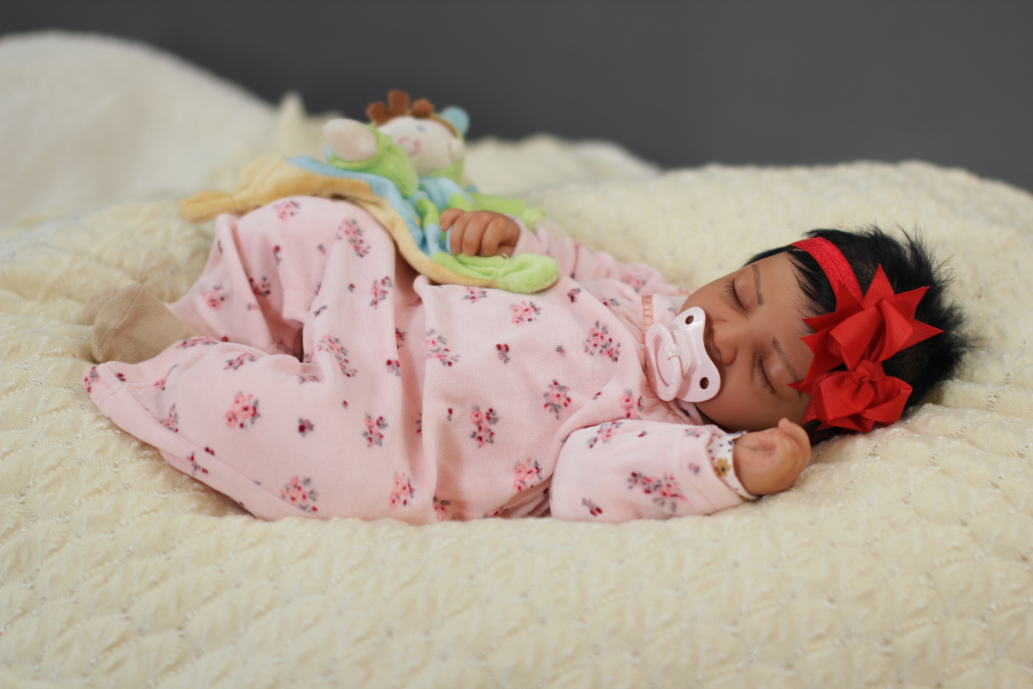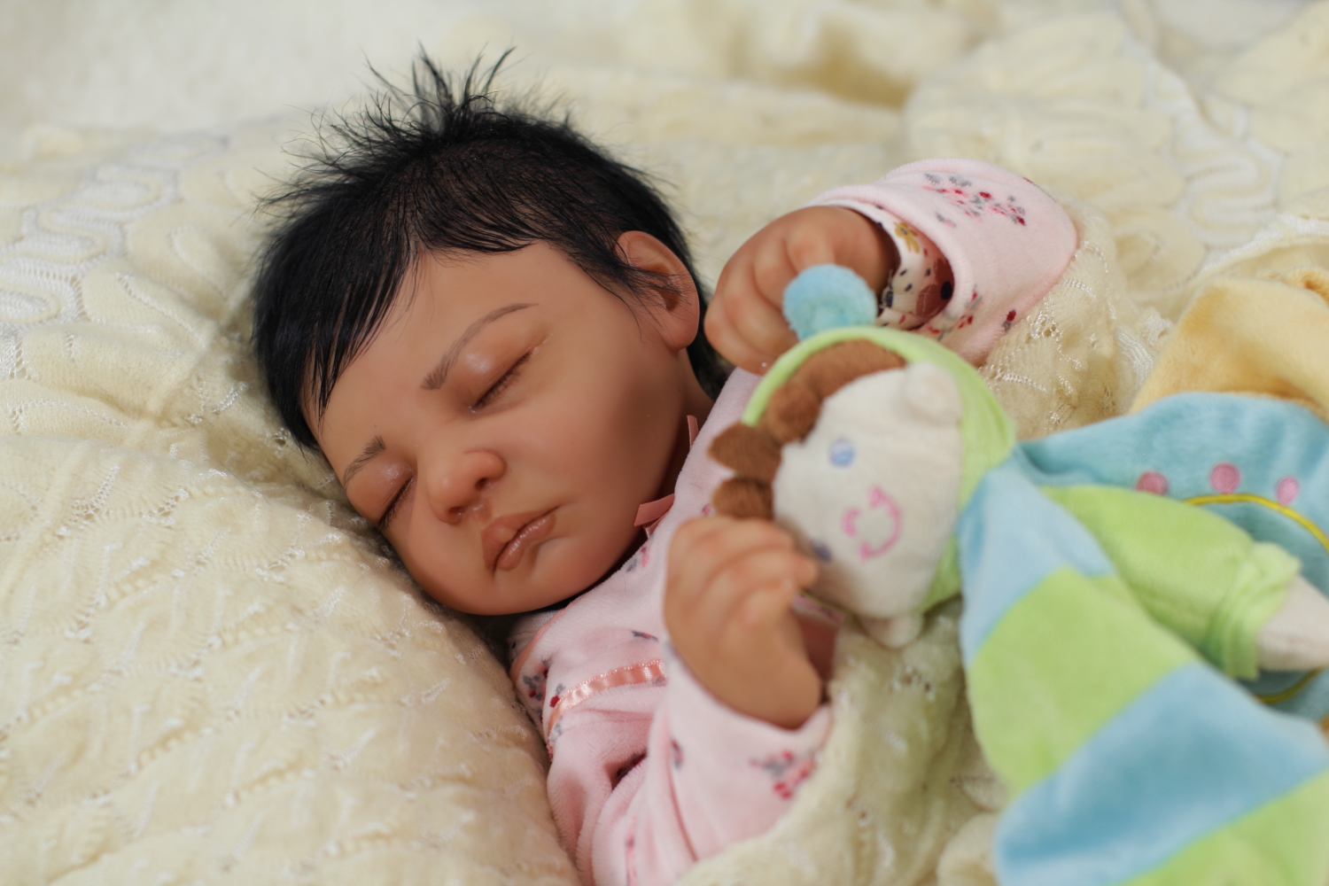 The body is weighted with large glass beads contained with a sack, then filled out with quality polyfill making the baby nice and cuddly and feeling like your holding a real baby.