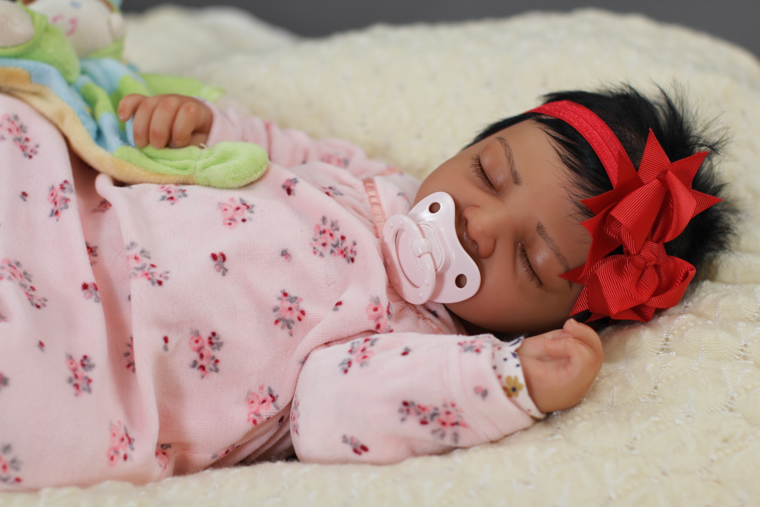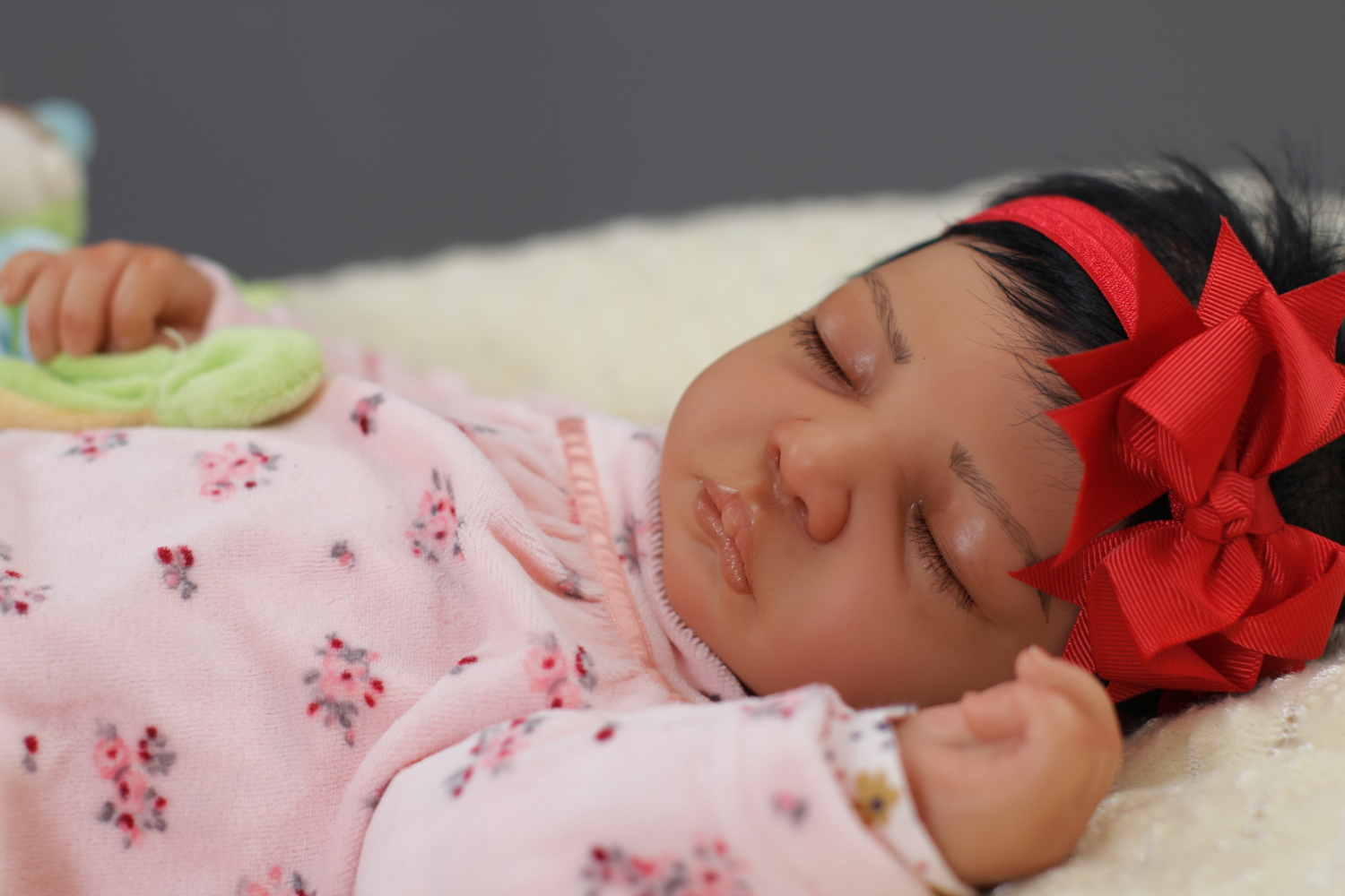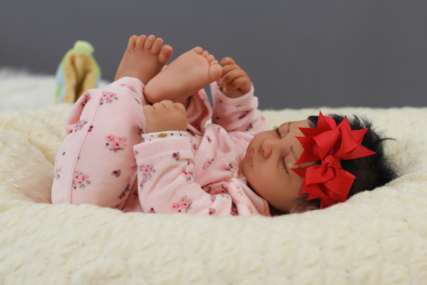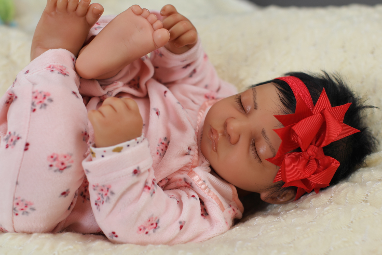 The body is weighted with large glass beads contained with a sack, then filled out with quality polyfill making the baby nice and cuddly and feeling like your holding a real baby.