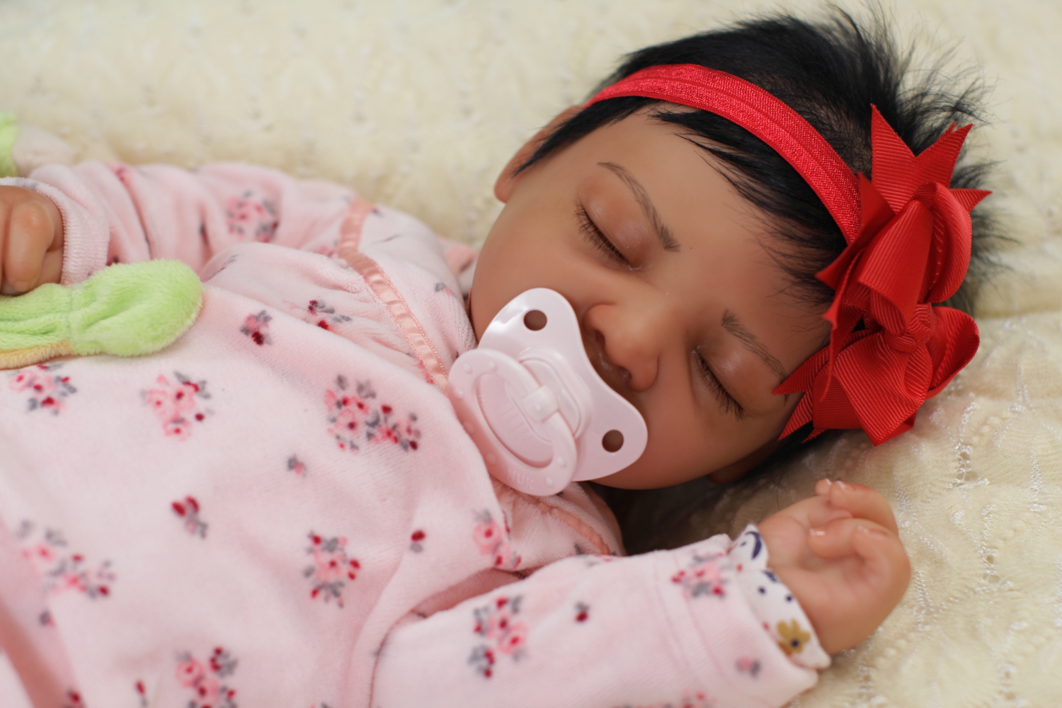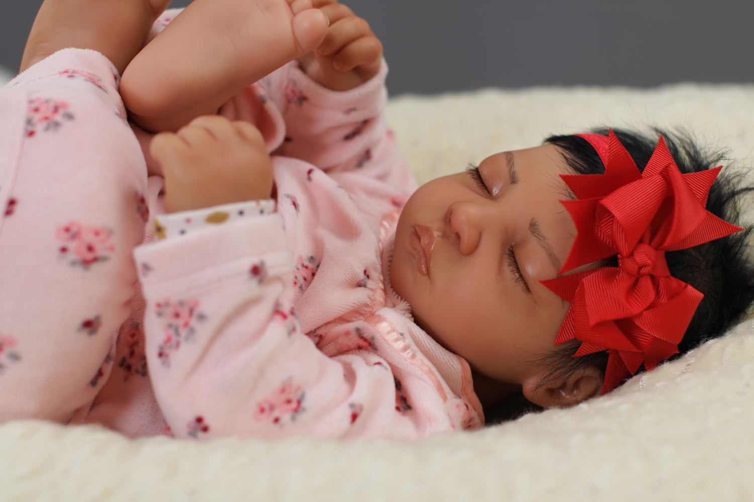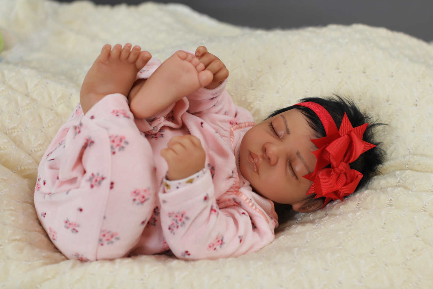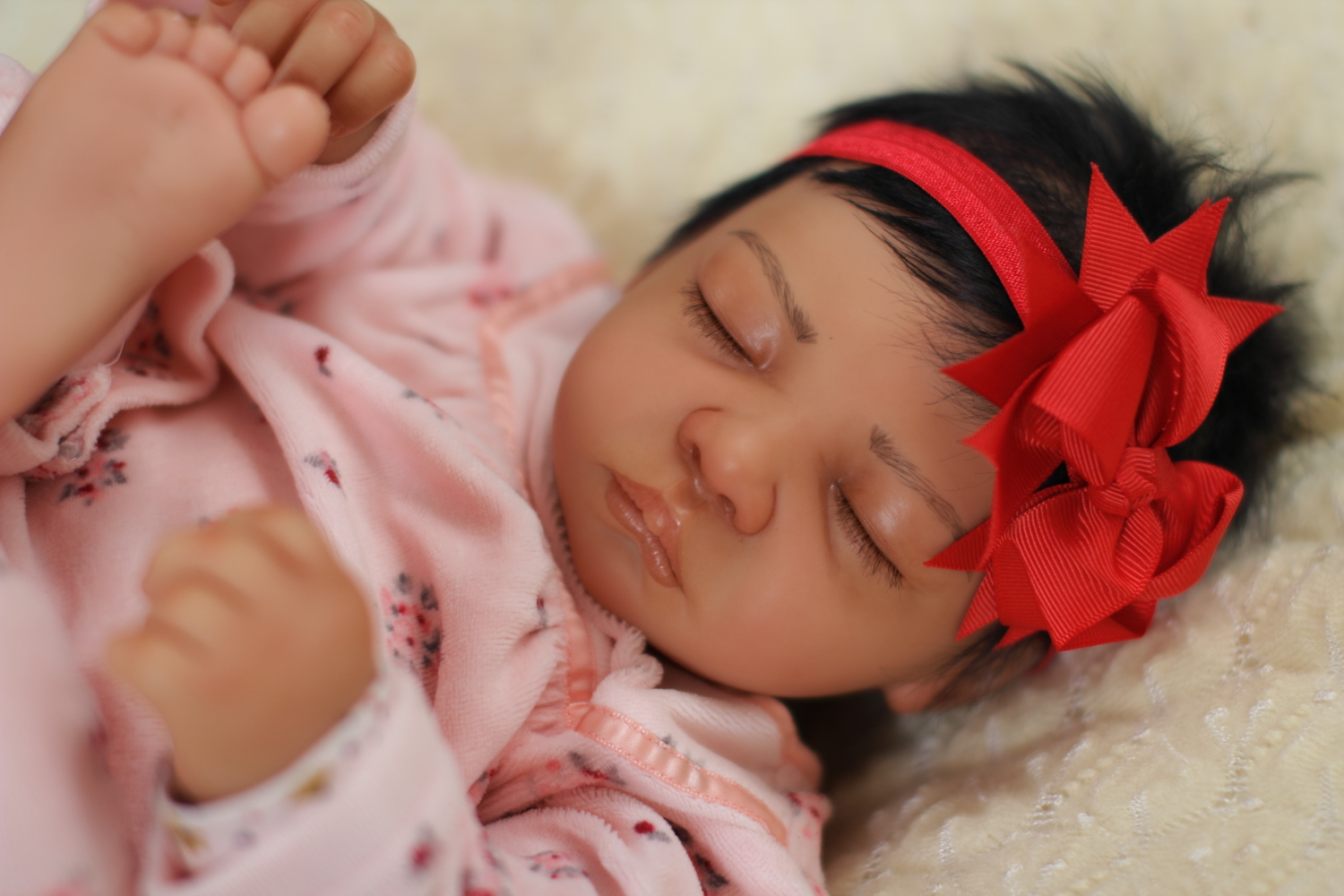 The body is weighted with large glass beads contained with a sack, then filled out with quality polyfill making the baby nice and cuddly and feeling like your holding a real baby.