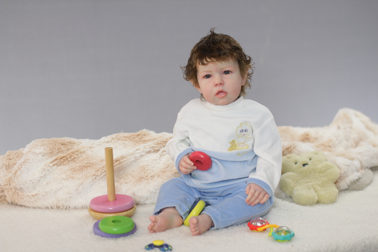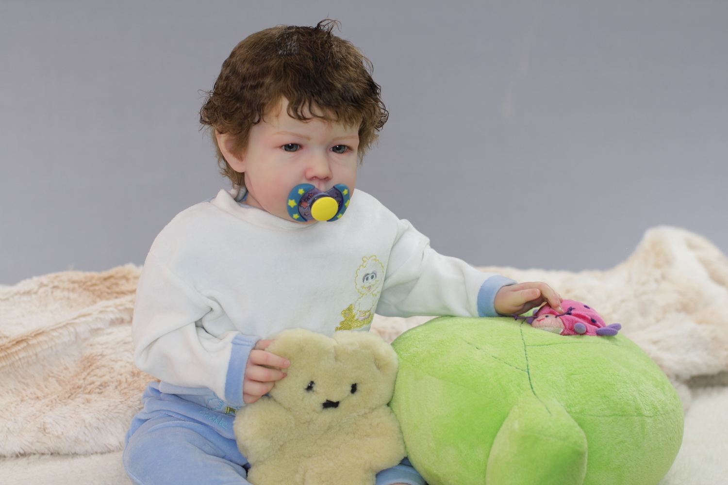 The body is weighted with large glass beads contained with a sack, then filled out with quality polyfill making the baby nice and cuddly and feeling like your holding a real baby.