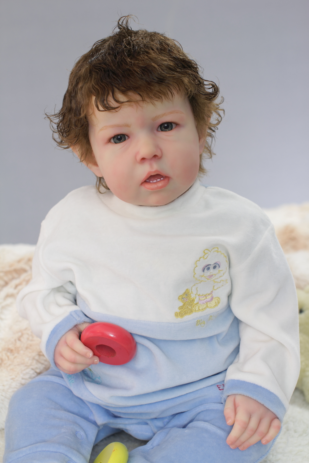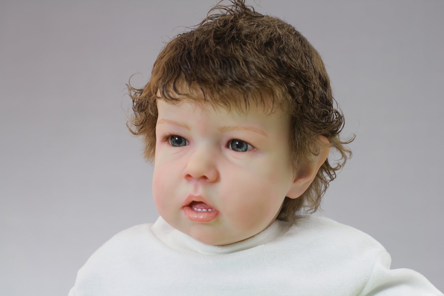 Painted hair on the baby is done all by hand, strand by strand using Real effects air dry paints.