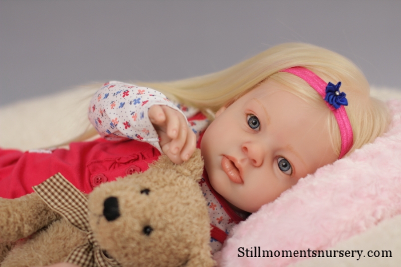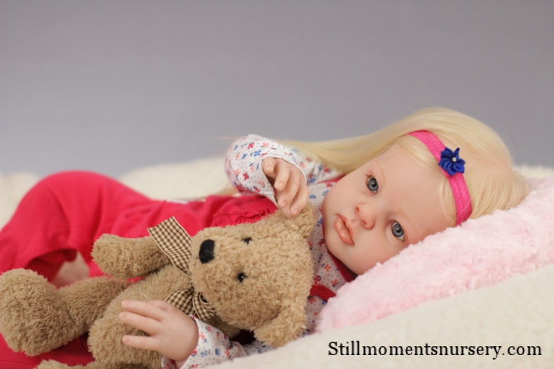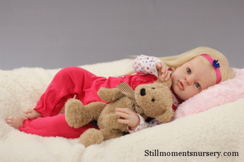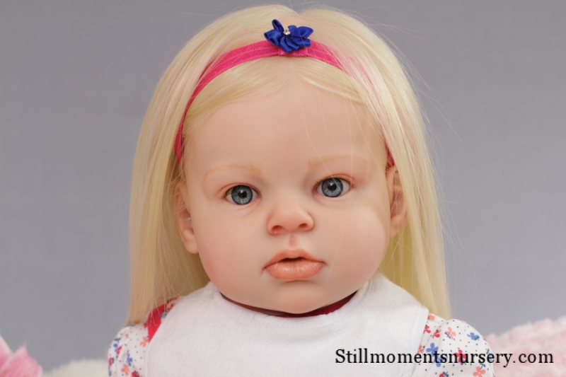 The body is weighted with large glass beads contained with a sack, then filled out with quality polyfill making the baby nice and cuddly and feeling like your holding a real baby.